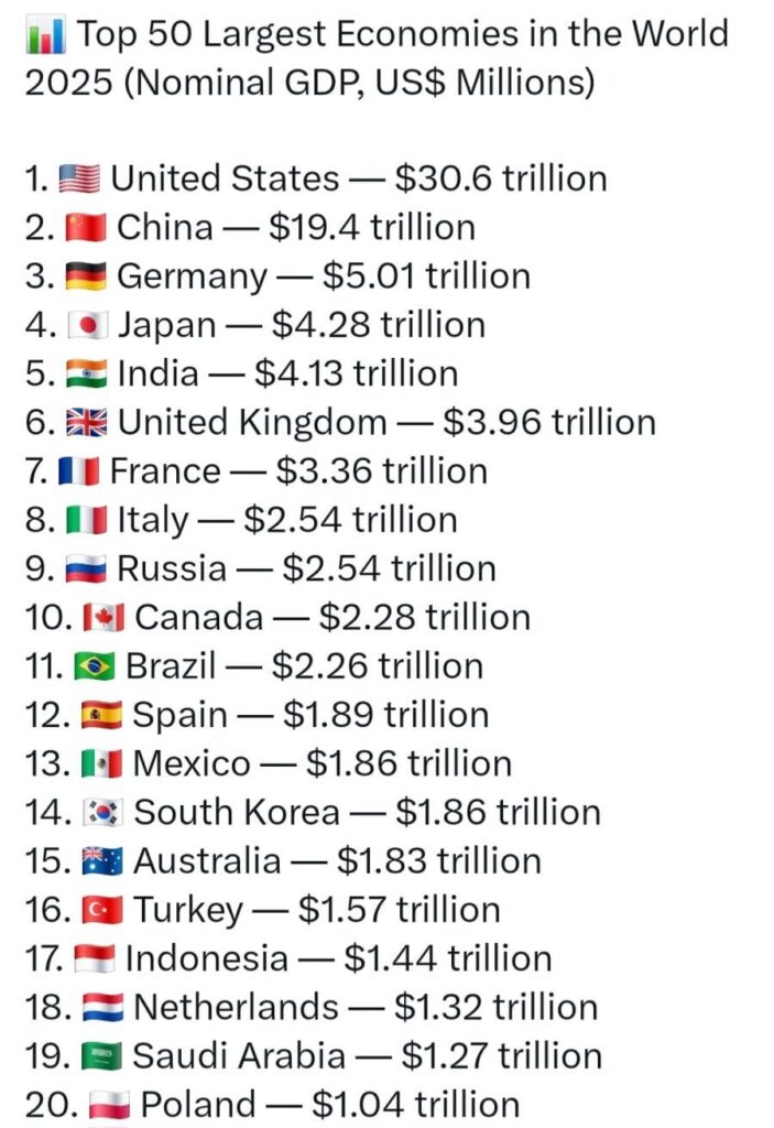 2025年の経済大国ランキング、1位~20位までのリストです。