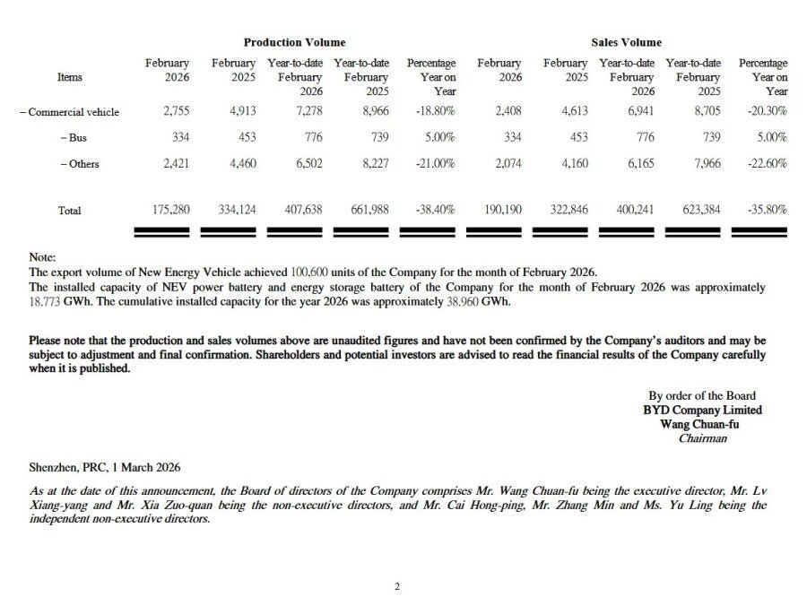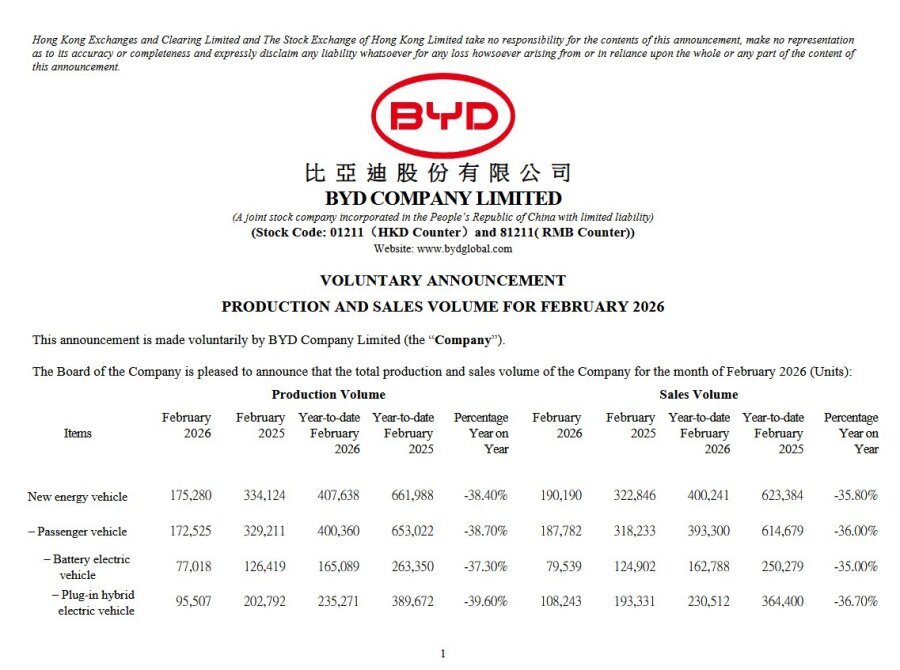 BYDの2026年2月の生産・販売台数についてです。